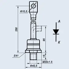 Максимально допустимий прямий імпульсний струм 10 А Максимальна постійна зворотна напруга 1300 В Діод В200-10 силовий 200А 1000В. Тип різьби М20, Стан на фото